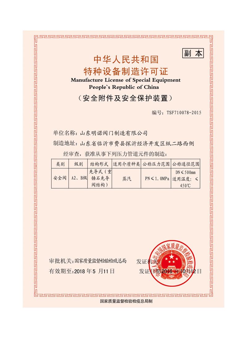 特種設備(bèi)制造許可證(安(an)全附件及安全(quán)保護裝置)